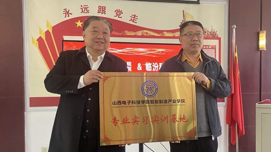 隨后,科海集團董事長吳晉龍和山西電子科技學院智能制造產(chǎn)業(yè)學院負責人趙春江進行了“山西電子科技學院智能制造產(chǎn)業(yè)學院專業(yè)實習實訓基地”授牌儀式。